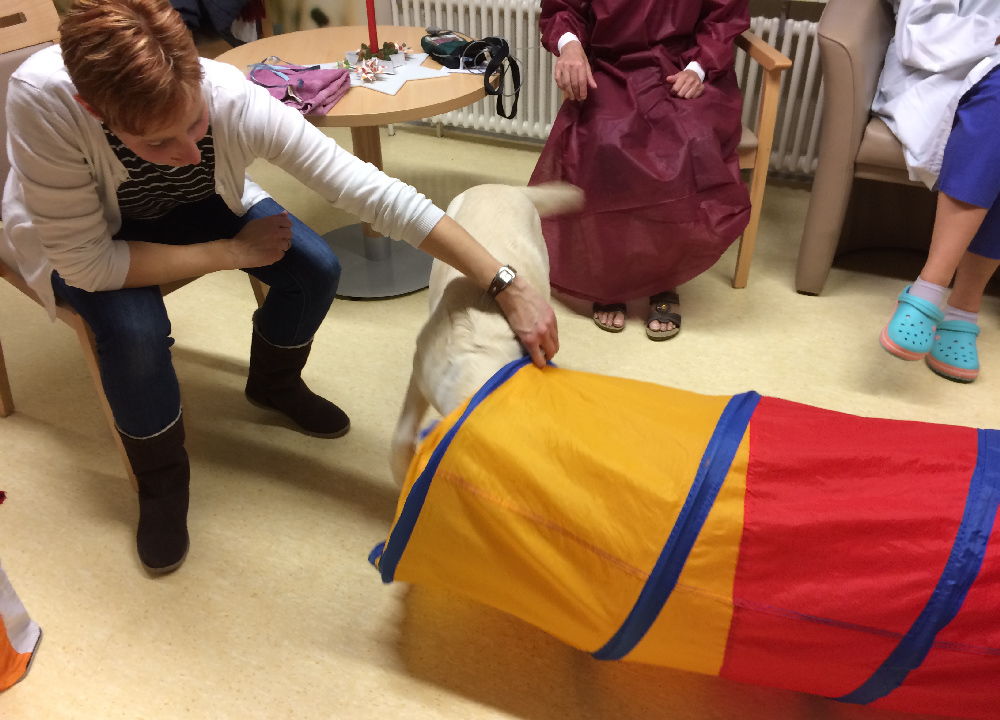 Juni 2015 | Das Therapiebegleithund-Team Odin mit Frauchen Ursula Kasper-Lehmann besuchen die Patienten wöchentlich auf der Palliativstation. Im Wintergarten können sich die Patienten eine Stunde lang mit Odin beschäftigen, es wird erzählt, gestreichelt, gespielt und gelacht. Die Kosten übernehmen wir. Labradoodle-Odin.de